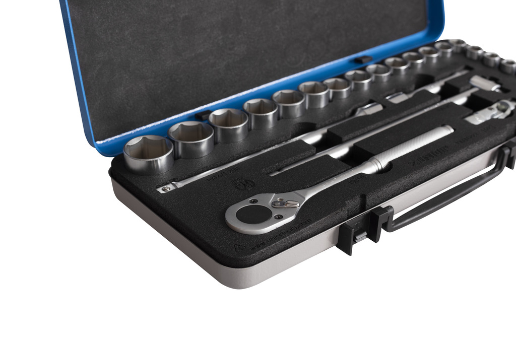 - Zubehör 1/2"; 1x Gleitgriff, 2x Verlängerung (125, 250mm), 1x Kardangelenk